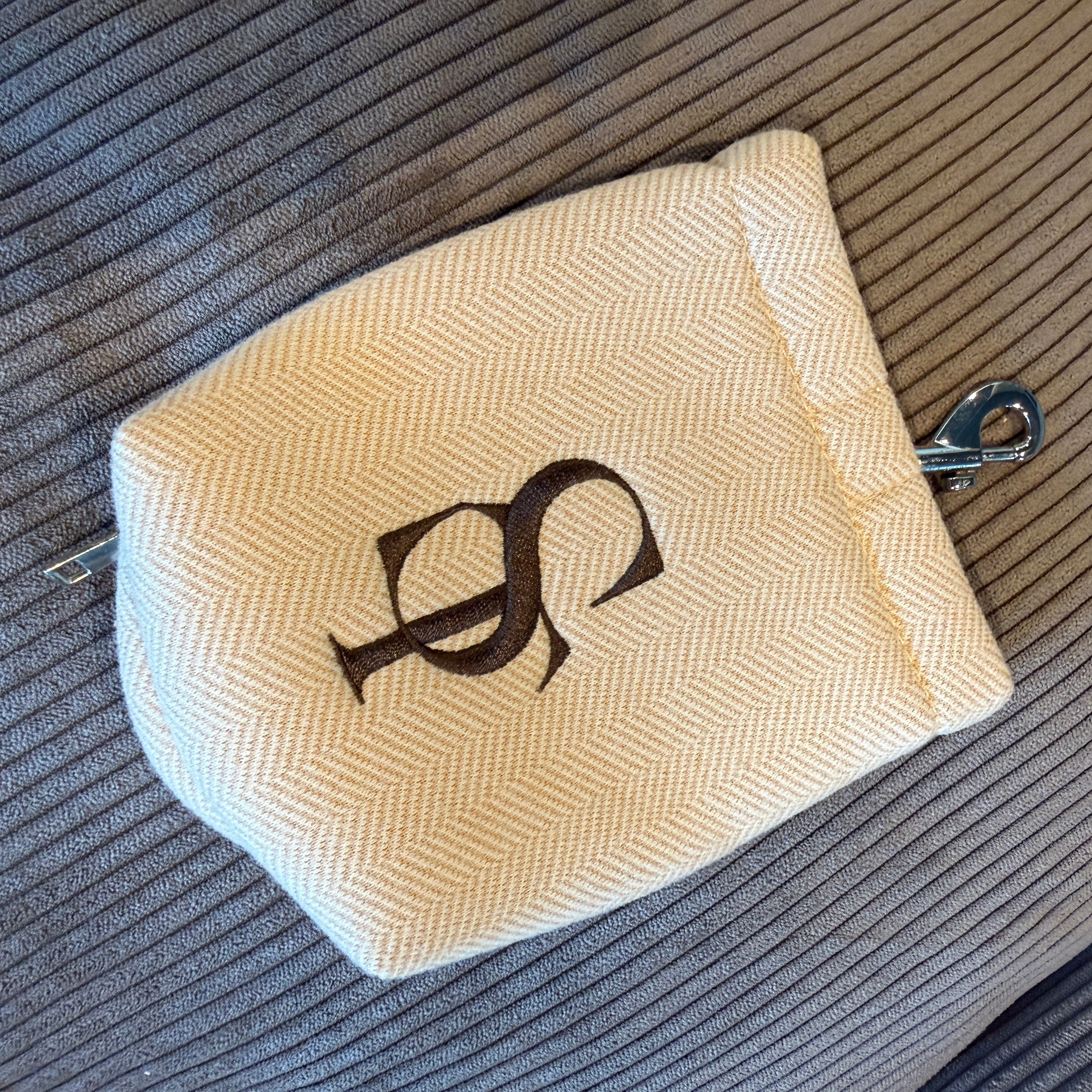 OBS: Monogram er syet i forkerte farve, hvorfor prisen er som den er!